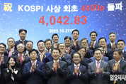 27일 서울 영등포구 한국거래소에서 정은보 한국거래소 이사장(앞줄 왼쪽 세번째)과 증권사 대표들이 코스피 지수 4000 돌파 기념촬영을 하고 있다. 정은보 한국거래소 이사장은 이날 열린 코스피 4000포인트 돌파 기념행사에서 “코스피 5000시대를 향한 새로운 출발선에 섰다”고 말했다. 그는 “이번 4000포인트 달성은 ‘코리아 디스카운트’ 해소 과정이자 주주가치 중심 경영의 결과”라며 “인공지능(AI)·반도체 등 신산업 중심의 산업 구조 전환과 자본시장의 적극적 지원이 병행될 때 ‘코리아 프리미엄’ 시대가 앞당겨질 것”이라고 밝혔다. 일요시사=고성준 기자(joonko1@ilyosisa.co.kr) <joonko1@ilyosisa.co.kr>
