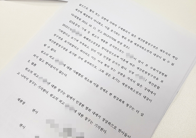 하지만 재판부는 “원고가 제출한 증거만으로는 A씨가 앞서 화해권고 결정을 받아들임으로써 이혼에 따른 재산분할청구권을 포기했다고 보기에 부족하고, 달리 이를 인정할 증거가 없다”고 판시했다.