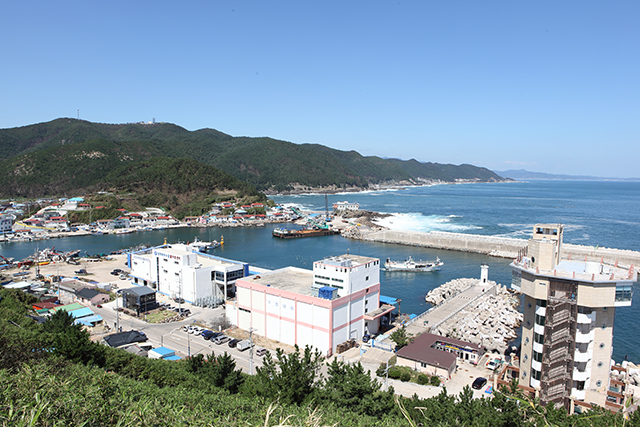 축산항은 물가자미로 유명한 작은 항구다. 항구 앞에 천연 방파제 역할을 하는 죽도산이 있다. 본래 섬인데 조선 시대 이후 모래 둔덕이 점점 쌓여 육지와 연결됐다고 한다. 해발 80m 정상에 죽도산전망대가 있다. 축산항등대에 전망대 기능을 더해 2011년 죽도산전망대로 새롭게 태어났다. 정상에 오르면 축산항 일대와 한없이 펼쳐진 동해가 들어온다. 팔각정 뒤쪽 나무 덱을 따라 올라가는 길에 쪽빛 바다가 눈부시다.