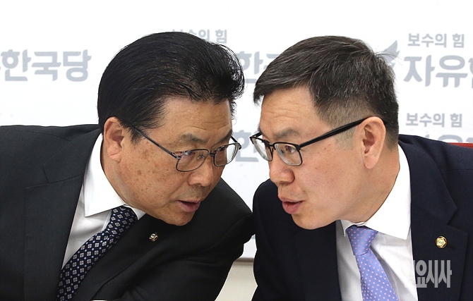 박맹우 자유한국당 사무총장(사진 왼쪽)과 정태옥 원내대변인이 자유한국당 의원이 21일, 서울 여의도 국회서 열린 원내대책회의에 앞서 이야기를 나누고 있다.