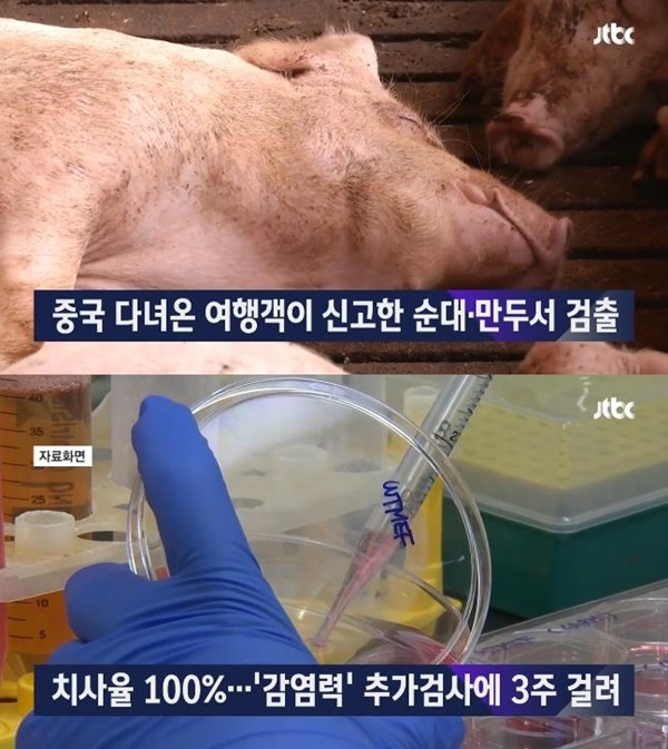 최근 중국에서 귀국한 A씨가 공항에 반납한 중국산 만두와 순대에서 아프리카 돼지열병 바이러스가 검출된 것.