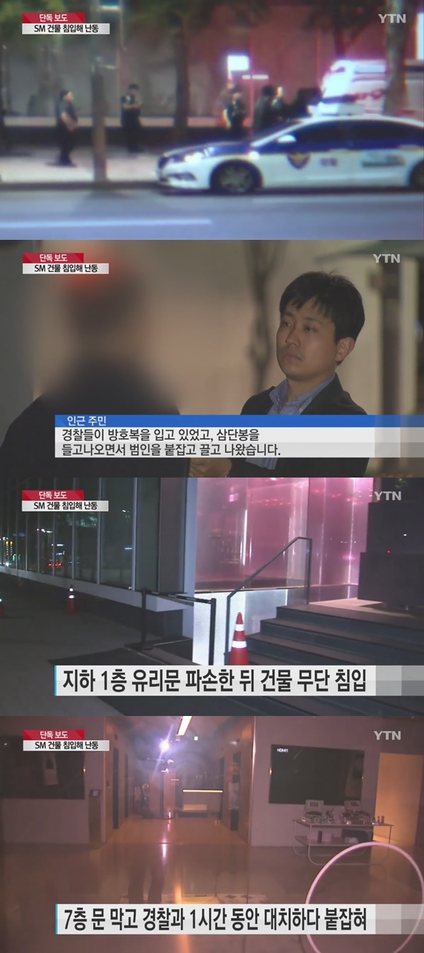 23일 서울 강남경찰서에 따르면 이날 자정께 삼성동에 위치한 SM엔터테인먼트 사옥의 유리문을 깬 뒤 무단침입을 시도한 36살 유모 씨를 검거해 조사하고 있다.