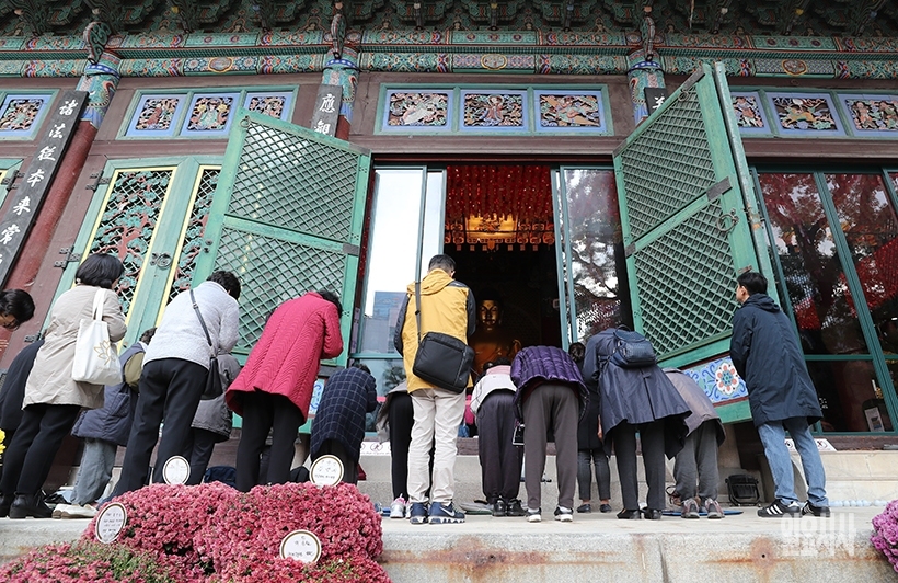 대학수학능력시험을 사흘 앞둔 11일 서울 종로구 조계사를 찾은 학부모들이 수능 고득점을 기원하며 기도하고 있다.