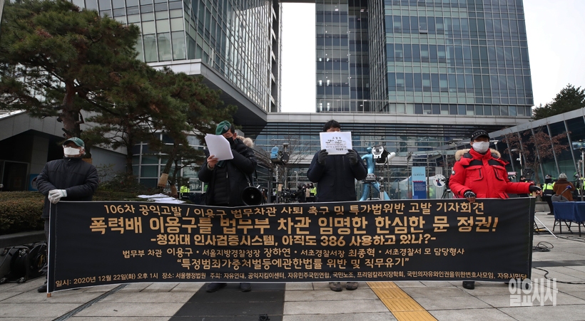 자유연대 및 시민단체 회원들이 22일 오후 서울 서초구 서울행정법원 앞에서 이용구 법무부 차관 사퇴 촉구 및 특가법 위반 고발 기자회견을 하고있다.