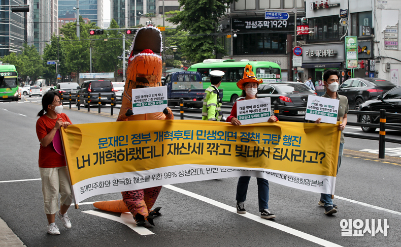 한국노동조합총연맹과 참여연대 등 시민단체 회원들이 1일 오후 서울 종로구 자하문로 일대에서 문재인정부 재벌개혁후퇴 및 민생외면 규탄 기자회견에 앞서 행진하고 있다. 이날 행진 및 기자회견 참석자들은 "재벌 개혁 후퇴 정책으로 경제 양극화가 심화됐다"며 문재인정부가 책무를 다할 것을 촉구했다.