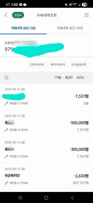 ‘군대에서 받은 월급을 다 쓰고 돈이 부족했나’고 생각했다는 그는 아들로부터 금융거래 내역서를 받고 아연실색하지 않을 수 없었다. 지난 15일 오후 6시13분(30만원), 오후 7시43분(50만원)에 각각 두 번의 송금이 이뤄져 있었던 것이다.