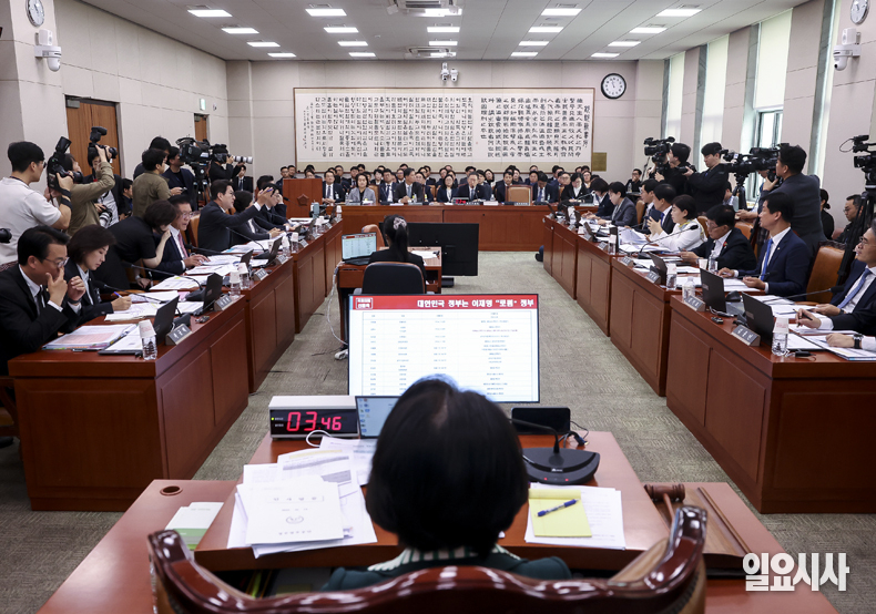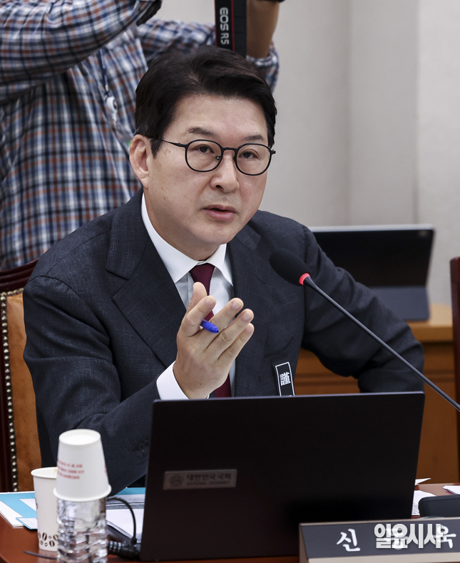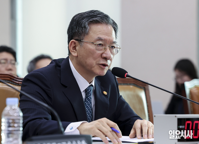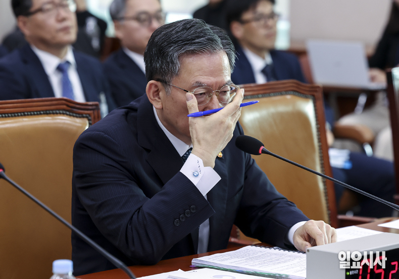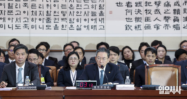 정성호 법무부 장관이 14일 서울 여의도 국회에서 열린 법제사법위원회 법무부 등에 대한 국정감사에서 국민의힘 신동욱 의원의 질의를 듣고 있다.