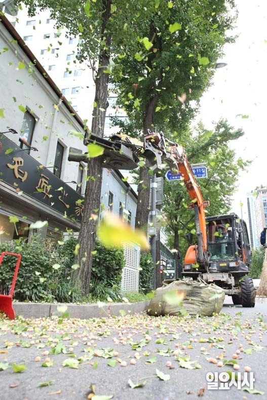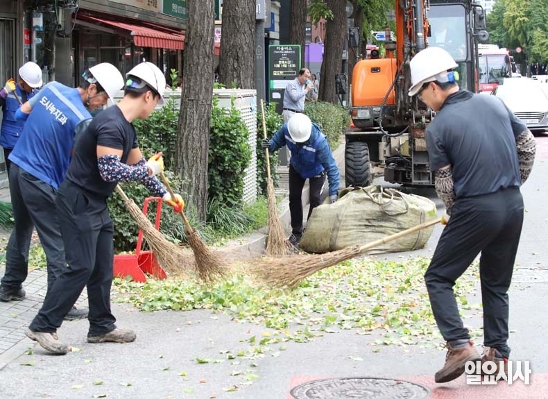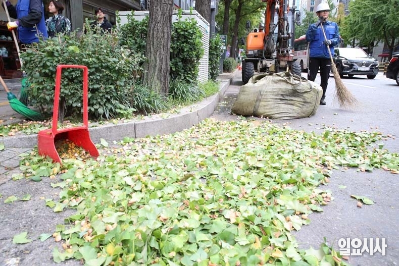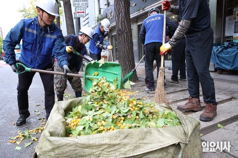 가을철로 접어들면서 은행나무 열매로 인한 악취 및 보행 불편 해소를 위해 14일 서울 종로구 일대에서 도시녹지과 관계자들이 은행나무 열매 채취 작업을 하고 있다.