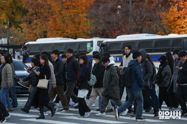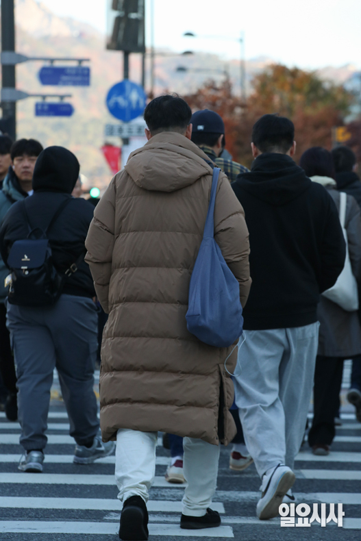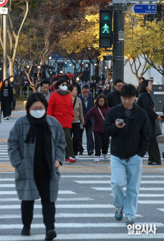 서울 아침 기온이 한 자릿수까지 떨어지며 초겨울 날씨를 보인 14일 오전 서울 종로구 광화문네거리에서 두터운 옷차림을 한 시민들이 출근길을 서두르고 있다.