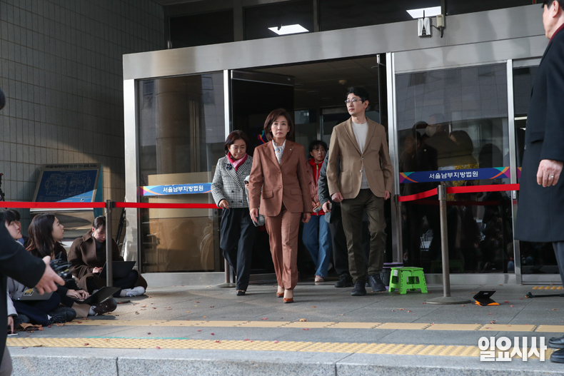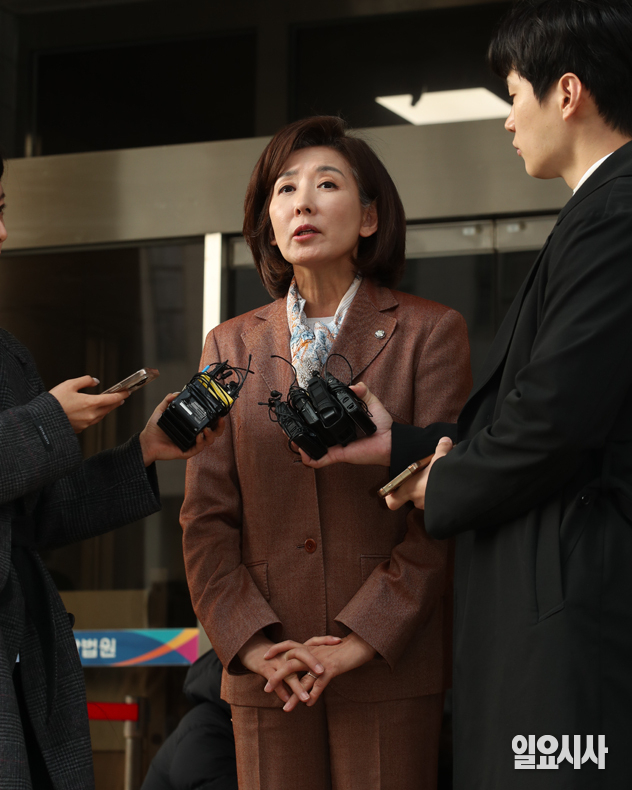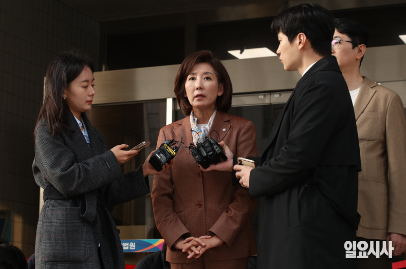 국민의힘 나경원 의원이 20일 서울 양천구 서울남부지방법원에서 열린 ‘패스트트랙 충돌 사건’ 1심 선고를 마친 뒤 법정을 나서며 심경을 밝히고 있다.