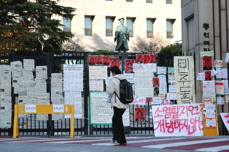 [일요시사 취재1팀] 서진 기자 = 두툼한 외투를 여민 여대생들이 기말고사를 앞두고 발걸음을 재촉했다. 율동기념음악관에서 흘러나오는 선율은 잠시 평온한 캠퍼스임을 상기시킨다. 그러나 건물 뒤편의 그림자 아래에는 여전히 붉고 푸른 래커 자국이 선명하다.