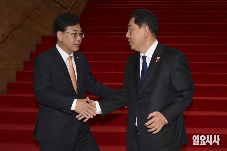 국민의힘 송언석 원내대표와 더불어민주당 김병기 원내대표가 9일 국회에서 우원식 국회의장 주재 회동을 마친 뒤 악수하고 있다.