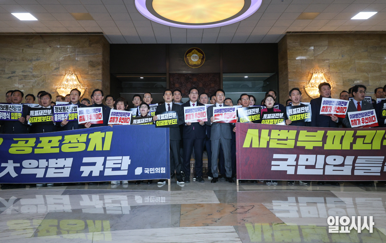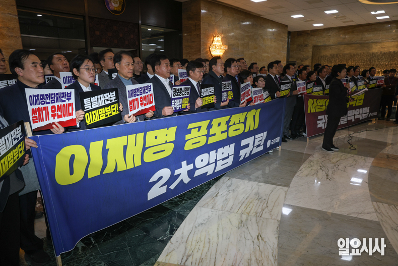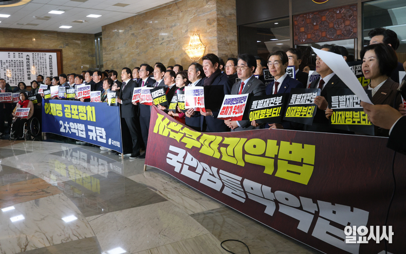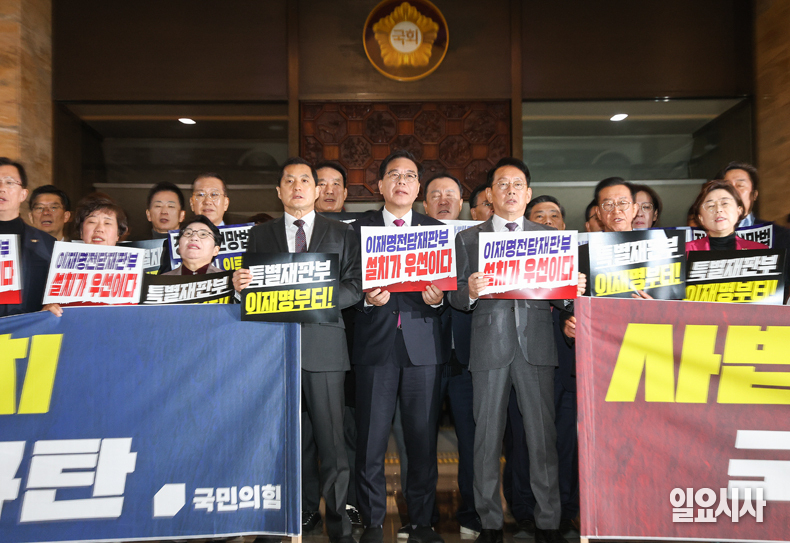 이날 국민의힘 의원들은 ‘이재명 전담재판부 설치가 우선이다’ ‘특별재판부 이재명부터’ 등의 손피켓을 들고 “이재명 전담 재판부부터 설치하라”고 구호를 외쳤다.