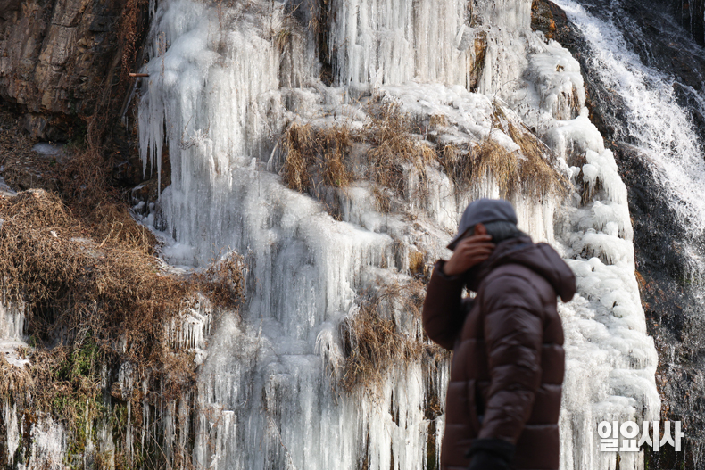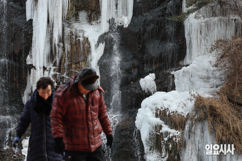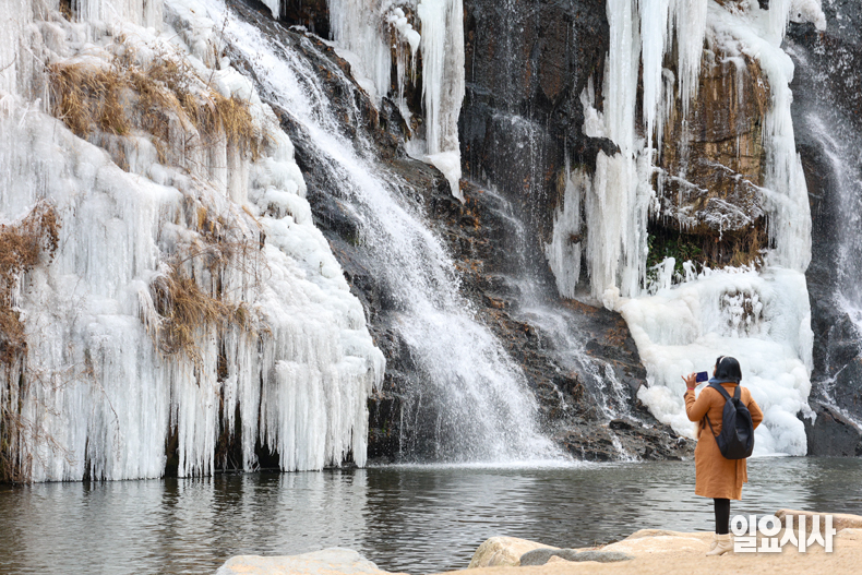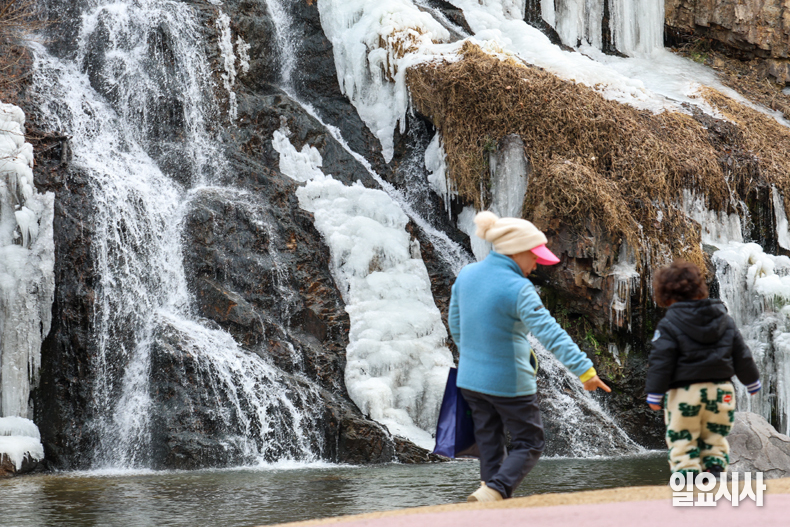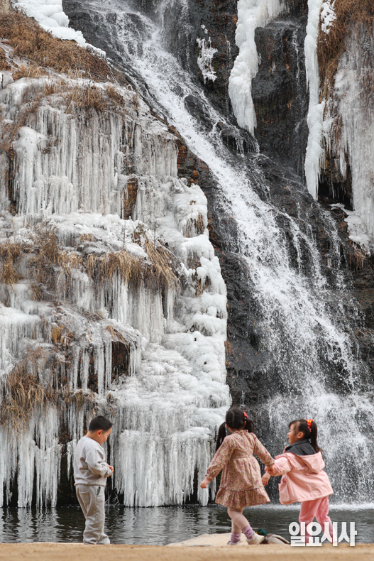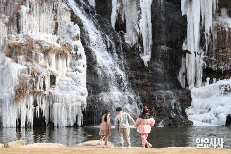 6일 오후 서울 서대문구 홍제천 인공폭포를 찾은 아이들이 얼어붙은 폭포 앞에서 즐거운 시간을 보내고 있다.