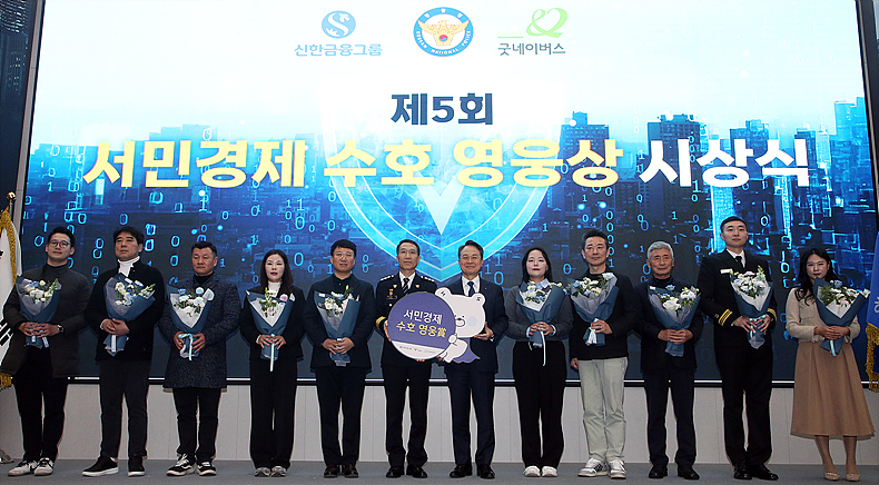 [일요시사 취재2팀] 김성화 기자 = 신한금융그룹(회장 진옥동)은 6일 오후 서울 서대문구에 위치한 경찰청 어울림마당에서 경찰청(청장 직무대행 유재성)과 함께 제5회 ‘서민경제 수호 영웅상’ 시상식을 개최했다.