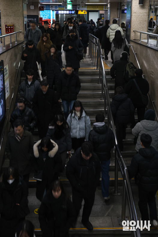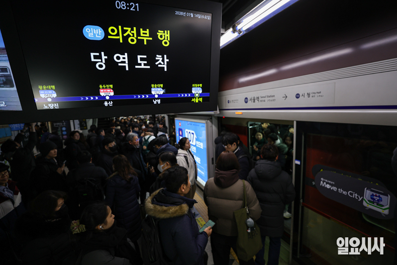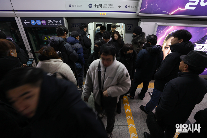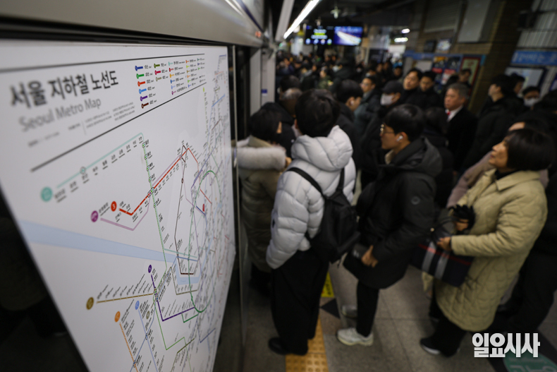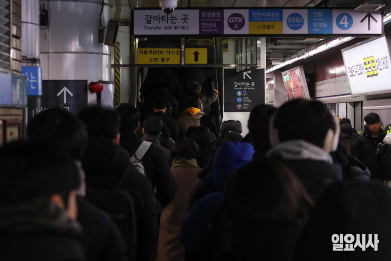 이틀 째 서울 시내버스 노조 파업으로 버스 운행이 중단된 가운데 14일 오전 서울 중구 서울역 지하철 1호선을 이용하려는 승객들로 승강장이 붐비고 있다.