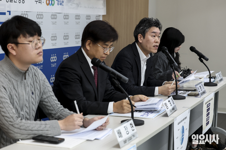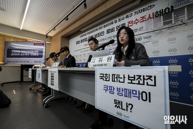 서휘원 경실련(경제정의실천시민연합) 정치입법팀장이 14일 서울 종로구 경실련 대강당에서 열린 '쿠팡 취업 국회 보좌진에 대한 로비의혹 조사 촉구 기자회견'에서 발언하고 있다.