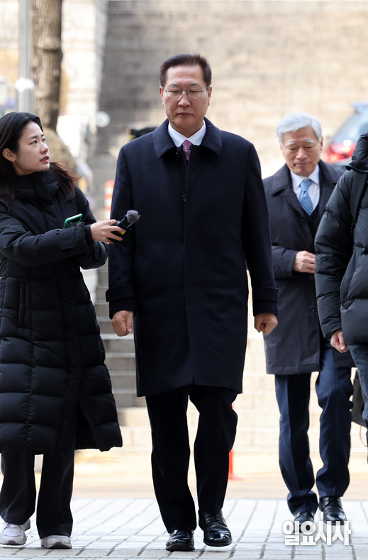박성재 전 법무부 장관이 26일 오후 서울 서초구 서울중앙지방법원에서 열린 내란 중요임무 종사 및 직권남용, 부정청탁금지법 위반 혐의 사건 공판 기일에 출석하면서 기자들의 질의에 답하고 있다.