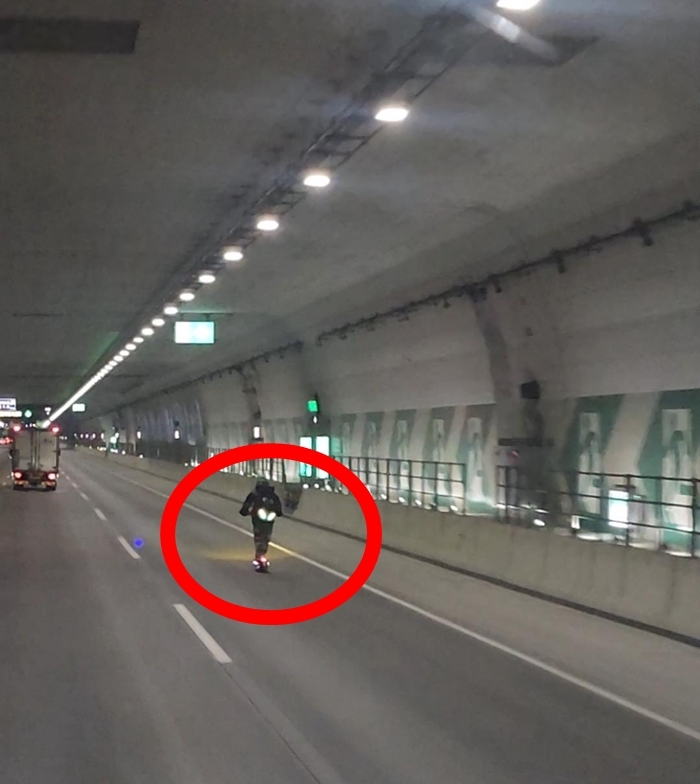 [일요시사 취재2팀] 박정원 기자 = 차량들이 고속으로 달리는 경부고속도로 지하 터널 한복판에 전동 킥보드 한 대가 나타나 주행하는 아찔한 모습이 포착돼 논란이 일고 있다.