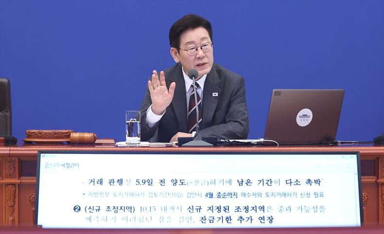 이날 이 대통령은 토지거래허가구역 내에서 세입자가 거주 중인 다주택자는 양도세 중과 유예 종료일인 오는 5월9일까지 처분하기 어렵다고 지적한 언론사 사설을 인용했다. 그러면서 “이미 4년 전부터 매년 종료가 예정됐던 것인데 대비하지 않은 다주택자 책임 아닌가”라고 덧붙였다.