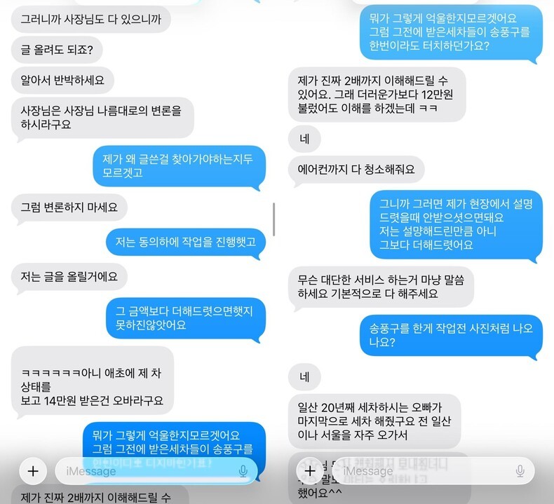 그러면서 “모든 손세차는 더러워져서 맡기는 것이고, 세차 후엔 당연히 깨끗해지는 건데 세차장 측은 전후 사진을 보여주며 약 3시간 동안 두 명이 작업했다는 취지로 설명했다”며 “그 과정에서 1년도 안 된 제 차를 10년 묵은 차량과 비교하기도 했다”고 주장했다.