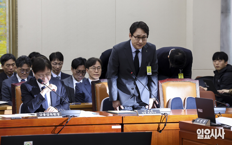 이재원 빗썸 대표이사와 관계자들이 11일 서울 여의도 국회에서 열린 정무위원회 전체회의 중 고개숙여 사과하고 있다.