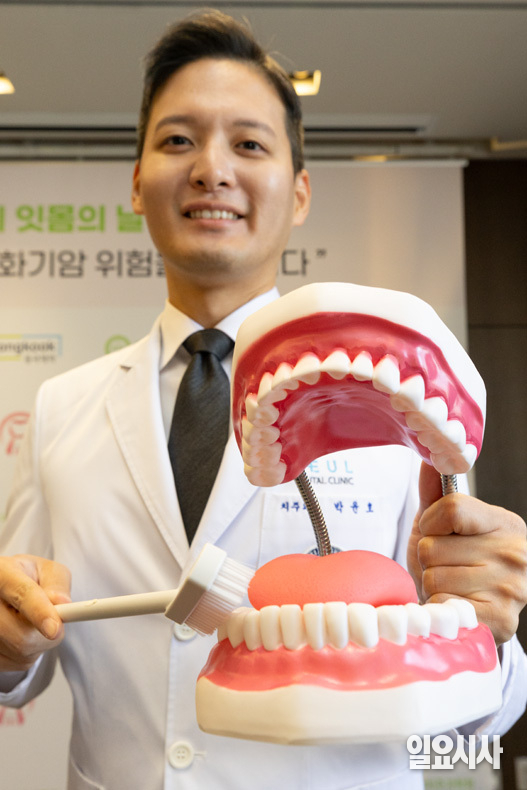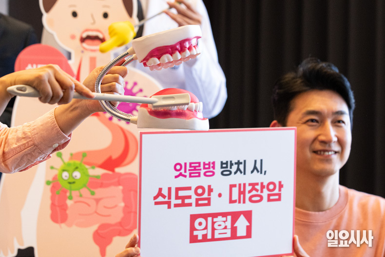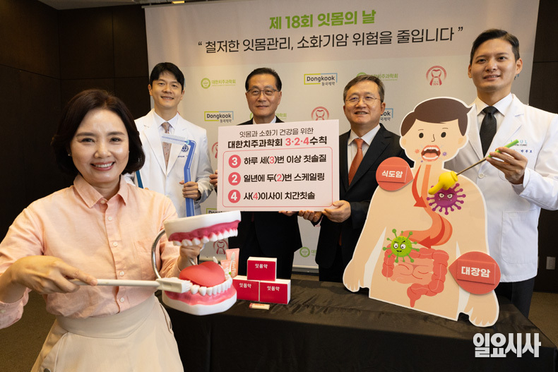 19일 오전 서울 중구 더 플라자 호텔에서 열린 ‘제18회 잇몸의 날 캠페인’에서 박영국 세계치과의사연맹 차기 회장(왼쪽에서 세 번째), 설양조 대한치주과학회 회장(왼쪽에서 두 번째) 및 홍보 모델들이 캠페인을 진행하고 있다.