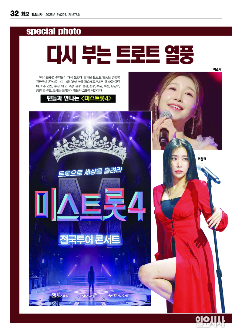 <미스트롯4> 주역들이 다시 모인다. 뜨거운 트로트 열풍을 증명할 전국투어 콘서트는 4월25일 서울 장충체육관에서 첫 막을 올린다. 이후 인천, 부산, 대구, 고양, 광주, 울산, 전주, 수원, 대전, 남양주, 창원 등 주요 도시를 순회하며 팬들과 호흡할 예정이다.