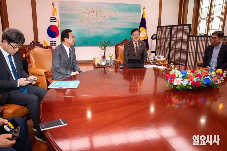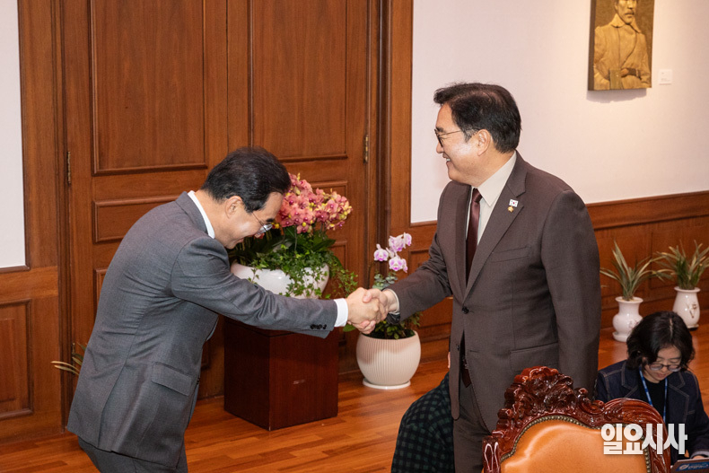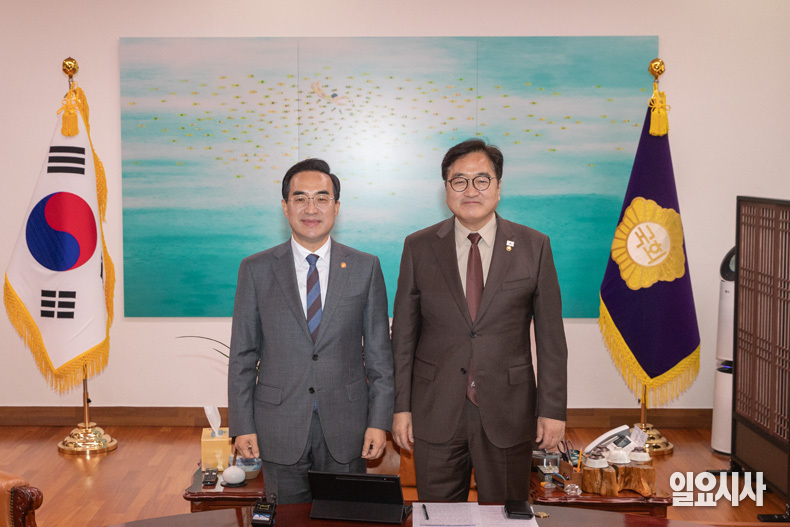 우원식 국회의장(오른쪽)과 박홍근 기획예산처 장관이 31일 오후 서울 여의도 국회에서 만나 사진 촬영을 하고 있다.