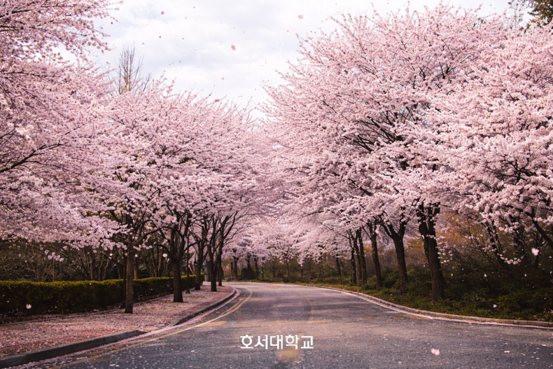 호서대 아산캠퍼스는 학문과 자연이 조화를 이루는 공간으로 잘 알려져 있다. 특히 캠퍼스 내 소류지를 따라 이어진 벚꽃길은 해마다 봄이면 분홍빛 꽃잎이 만개해 장관을 이룬다. 호서대는 <재벌집 막내아들> <어게인 마이 라이프> 등 수십편의 영화와 드라마 촬영이 이어진 장소로 알려져 있다.