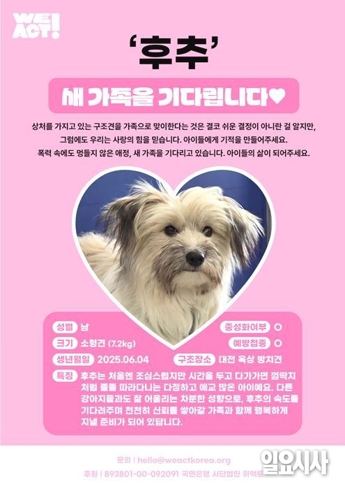 상처를 가지고 있는 구조견을 가족으로 맞이한다는 것은 결코 쉬운 결정이 아니란 걸 알지만, 그럼에도 우리는 사랑의 힘을 믿습니다. 아이들에게 기적을 만들어주세요.