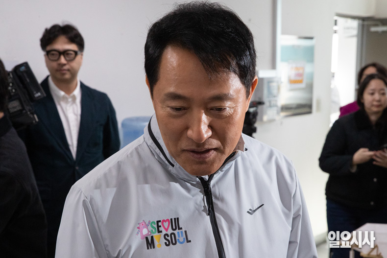 오세훈 서울시장이 8일 오전 서울 중구 서울중앙시장을 방문해 디자인혁신 전통시장 조성사업 추진 현황 브리핑을 듣던 중 관계자에게 질문하고 있다.