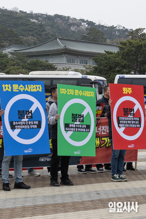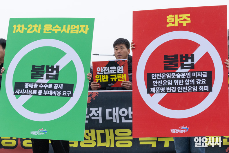 민주노총 공공운수노조 화물연대본부가 9일 오전 서울 종로구 청와대 분수대 앞에서 열린 ‘유가 폭등 근본적 대안, 안전운임제가 무너진다 이재명 정부 엄정대응 촉구 기자회견’에서 피켓을 들고 있다.