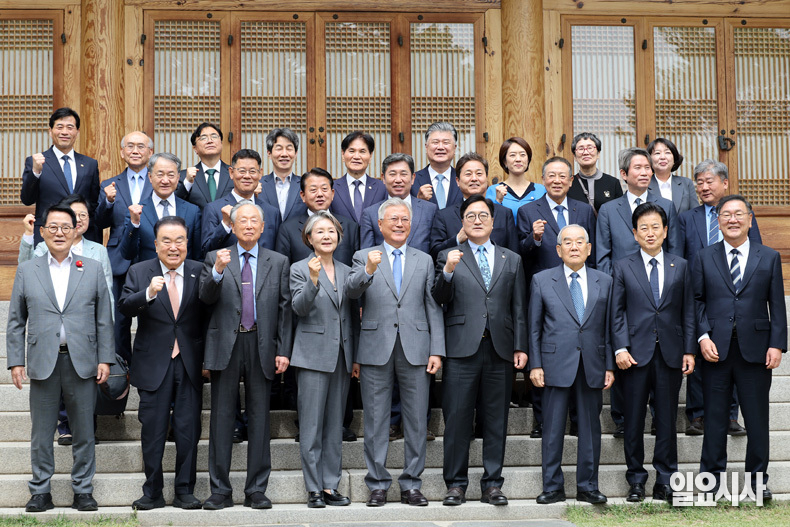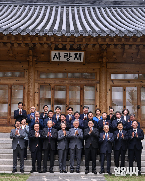 문재인 전 대통령과 김정숙 여사가 27일 오후 서울 여의도 국회 의원회관 대회의실에서 열리는 4.27 판문점선언 8주년 행사 참석으로 국회를 방문해 우원식 국회의장과 사랑재에서 오찬 후 참석지들과 기념 촬영을 하고 있다.