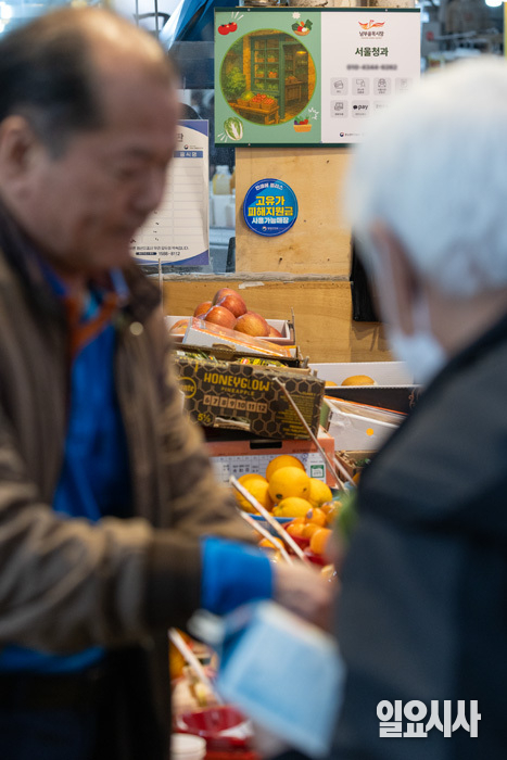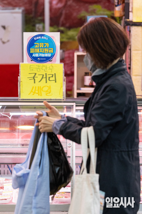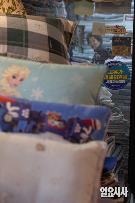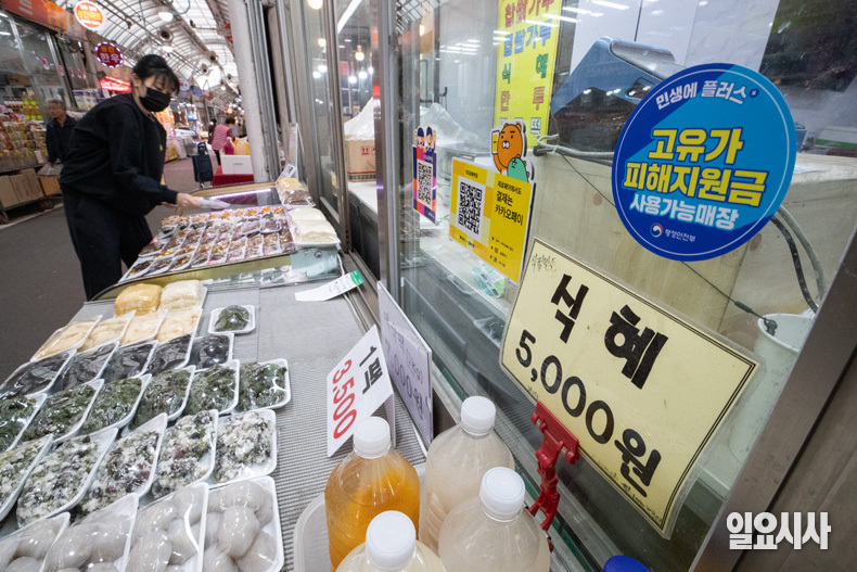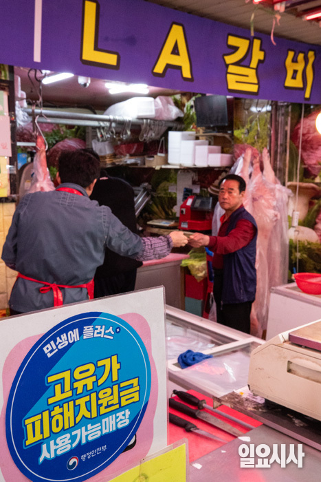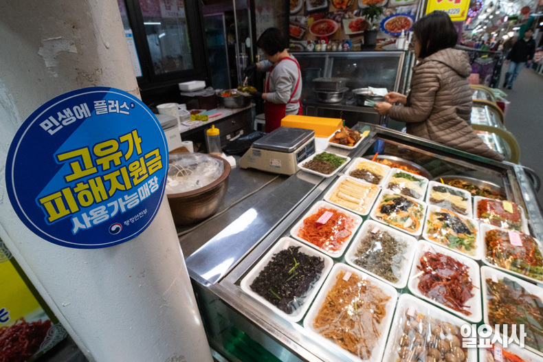 고유가 피해 지원금 1차 지급이 시작된 가운데 28일 오후 서울 강서구 남부골목시장에 ‘고유가 피해지원금 사용 가능 매장’ 스티커가 붙어 있다.