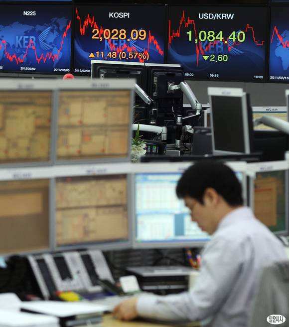 미국 증권시장에서 다우지수가 사상 최고치를 경신한 가운데 6일 오전 코스피 지수가 2020선 후반대를 오르내리고 있다. 사진은 이날 서울 중구 외혼은행 본점 딜링룸.