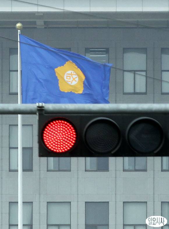 여야의 대립으로 정부조직법 개편안 협상은 진통을 거듭하고 있는 가운데 8일 서울 여의도 국회의사당 앞 신호등에 빨간불이 켜져 있다.