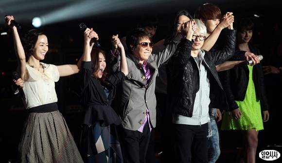 '가왕' 조용필이 23일 오후 서울 방이동 올림픽공원 내 올림픽홀에서 열린 19집 정규 앨범 '헬로(Hello)' 발매 기념 '프리미어 쇼케이스-헬로!'를 마친 뒤 후배 가수들과 함께 인사하고 있다.
