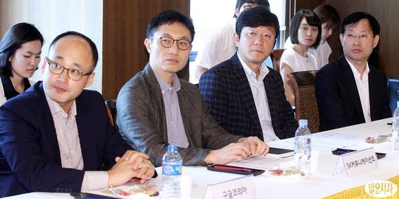 24일 오후 서울 중구 프레스센터에서 열린 '제1차 인터넷 상생발전 협력회의'에서 참석자들이 프리젠테이션을 보고 있다. 오른쪽부터 김상헌 NHN대표, 이병선 DAUM이사, 김종훈 SK컴즈 이사, 염동훈 구글코리아 대표.