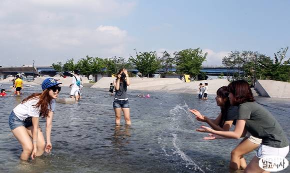 장마가 잠시 주춤, 전국적으로 무더운 날씨를 보인 24일 서울 여의도 한강공원 물빛광장을 찾은 시민들이 물놀이를 하며 더위를 식히고 있다.