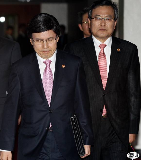 황교안 법무부 장관(왼쪽)과 최문기 미래창조과학부 장관이 2일 오후 서울 세종로 정부서울청사에서 열린 국무회의에 참석하고 있다.