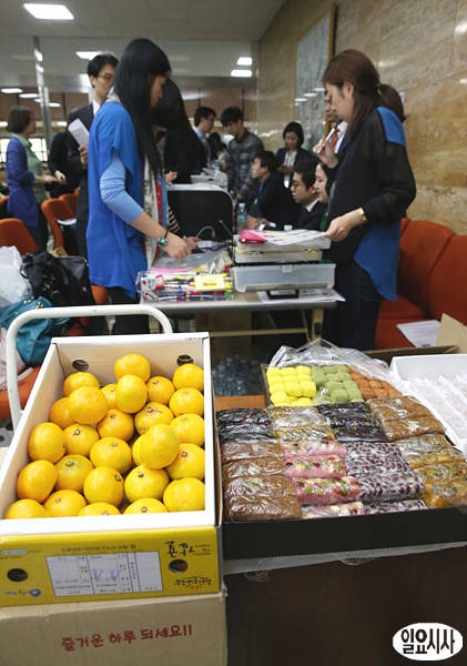14일, 서울 여의도 국회에서 열린 외교부 국정감사 첫날, 국감장 주변에 떡과 과일 등이 비치돼 있다.