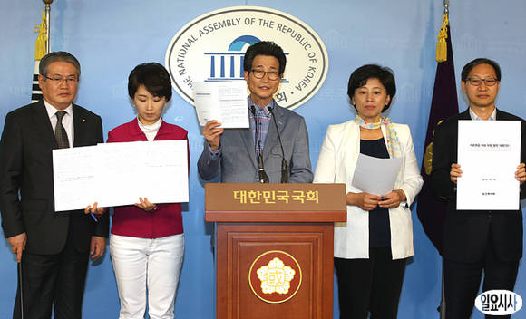 이목희, 이언주 등 국회 보건복지위 소속 민주당 의원들이 16일 오전 국회 정론관에서  보건복지부가 국정감사를 앞두고 새누리당 의원들에게 '기초연금 야당 의원 발언 대응' 자료를 만들어 배포했다며 공개하고 있다.