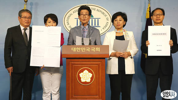 이목희, 이언주 등 국회 보건복지위 소속 민주당 의원들이 16일 오전 국회 정론관에서  보건복지부가 국정감사를 앞두고 새누리당 의원들에게 '기초연금 야당 의원 발언 대응' 자료를 만들어 배포했다며 공개하고 있다.