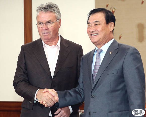 강창희(오른쪽) 국회의장이 16일 오후 서울 여의도 국회를 방문한 거스 히딩크 전 한국 축구대표팀 감독과 인사를 나누고 있다.
