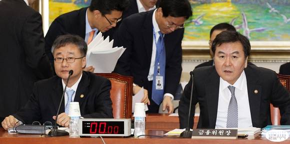 신제윤 금융위원장(오른쪽)이 17일 서울 여의도 국회에서 열린 정무위원회의 금융위원회 국정감사에 출석하고 있다. 왼쪽은 정찬우 부위원장.