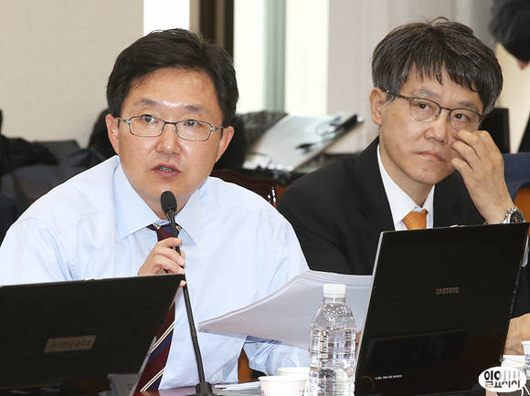 새누리당 김용태 의원이 17일 오후 서울 여의도 국회 정무위원회의실에서 열린 금융위원회 국정감사에서 현재현 동양그룹 회장에게 질의하고 있다.