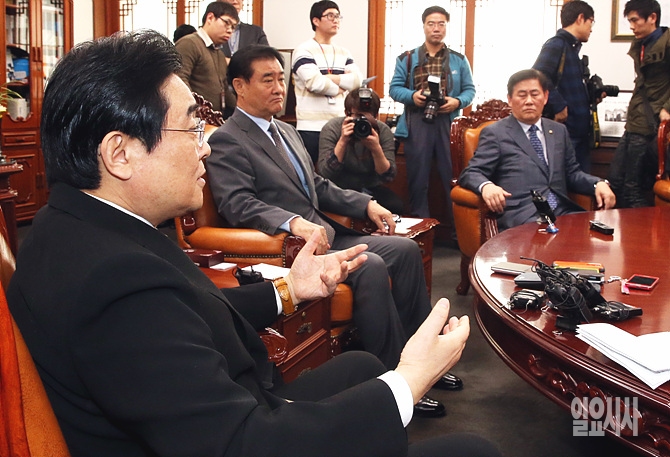 17일, 전병헌 민주당 원내대표가 국회의장실에서 열린 강창희 의장과 여야원내지도부 회동에서 원자력방호방재법 개정안 처리에 대한 당의 입장에 대해 말하고 있다.