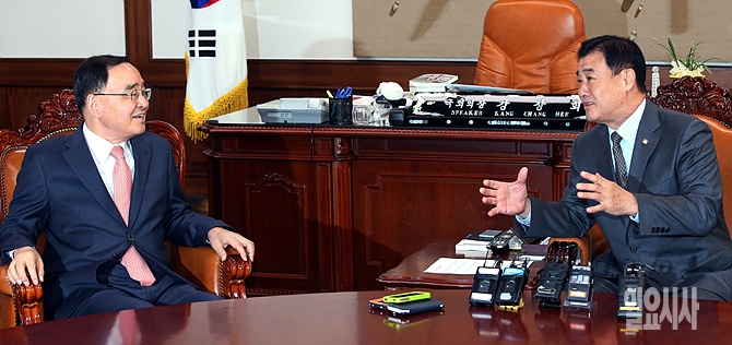 17일, 정홍원 국무총리가 국회 의장실에서 강창희 국회의장과 원자력방호방재법 개정안 처리에 관련해 대화하고 있다.