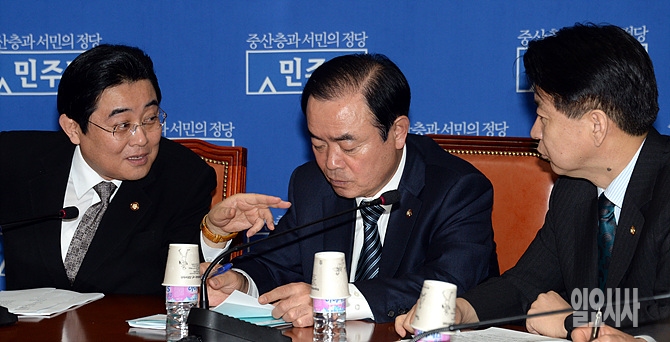 18일 오전, 전병헌 민주당 원내대표(사진 왼쪽)가 서울 여의도 국회에서 열린 원내대책회의 도중, 장병완 정책위의장, 노웅래 사무총장과 이야기를 하고 있다.